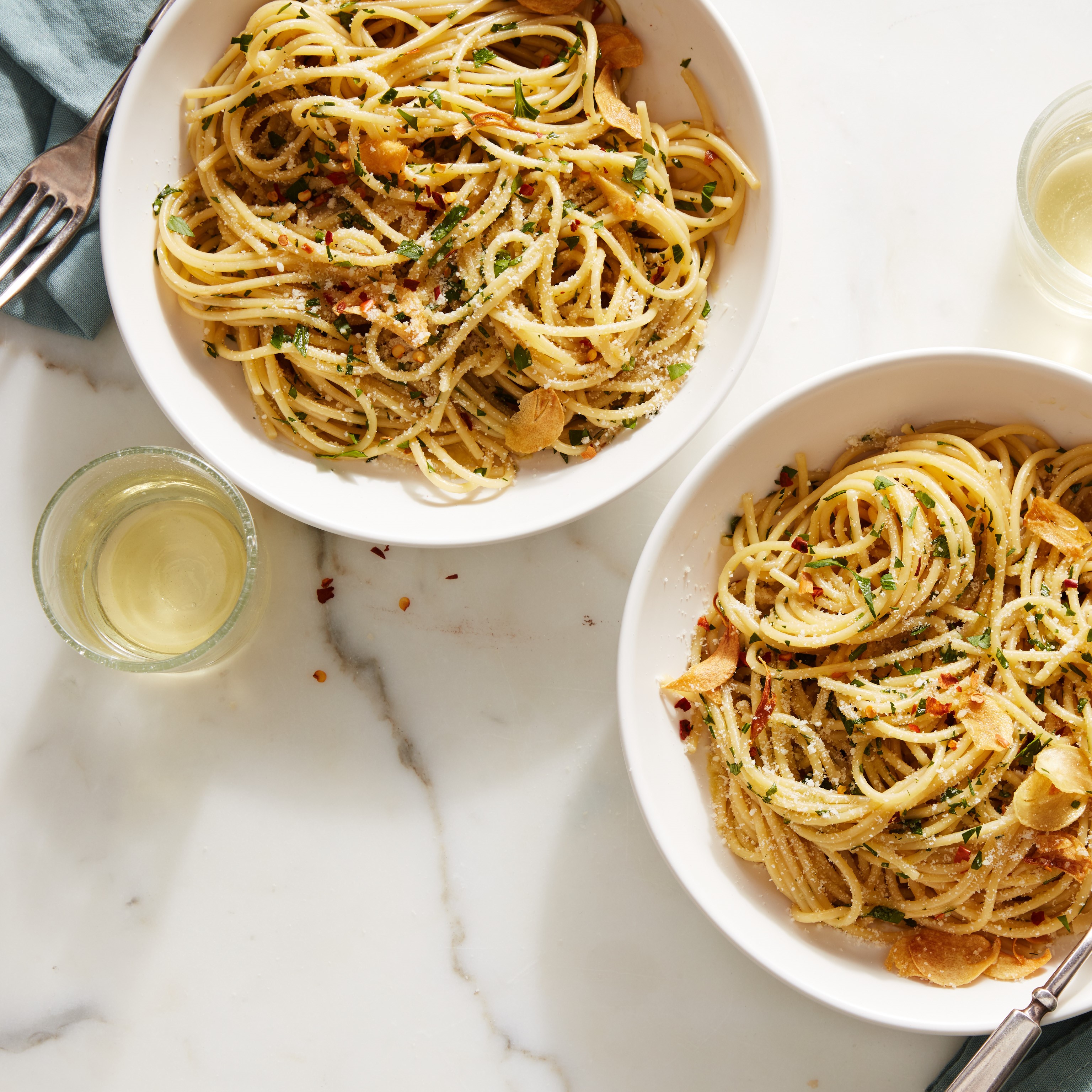 Pasta aglio e olio is a simple and delicious Italian dish made with basic pantry ingredients. It typically includes spaghetti, garlic, olive oil, red pepper flakes, and Parmesan cheese. It's a quick and flavorful dish that can be easily prepared at home. This recipe creates 4 servings.