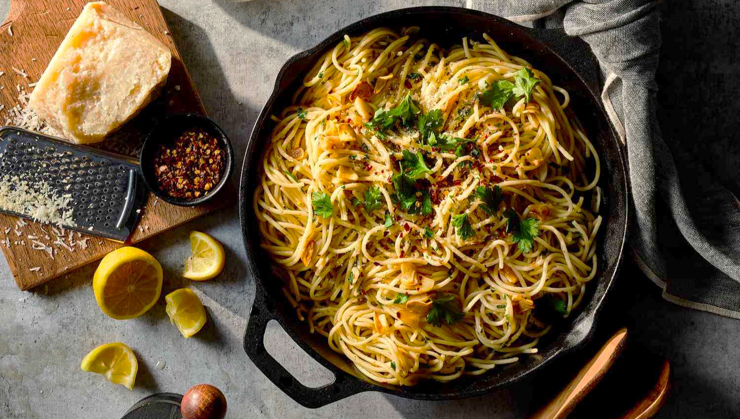 3. Remove pan from heat, add parsley, lemon juice, and Parmesan and toss well. Check for flavor, adding more salt if necessary. Garnish with more Parmesan, lemon wedges, and crushed red pepper flakes.